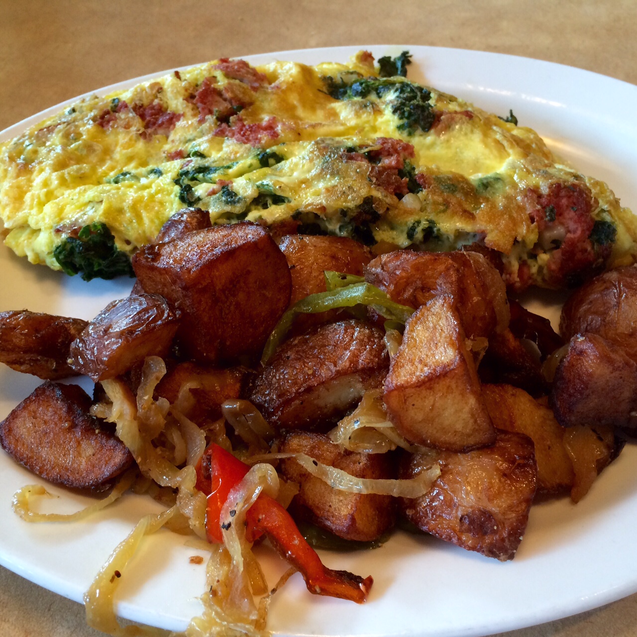 We decided to create our own omelette next selecting corned beef hash, spinach & provolone cheese which came with a side of home fries. This omelette was delicious. The corned beef added a nice little crunch element inside and provided the right amount of saltiness which played nicely with the spinach and cheese. We really enjoyed this dish. The home fries, although we had asked for them to be cooked well done/crispy didn’t quite live up to our expectations. The potatoes, in my opinion, had a heavy, dense consistency, although the grilled onions and peppers added a nice flavor.