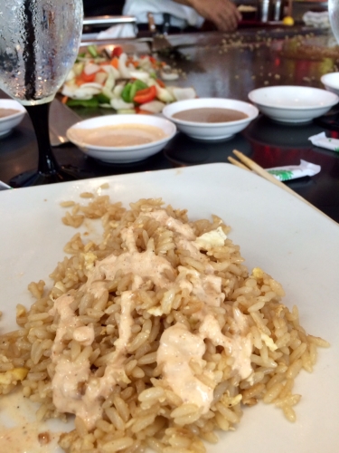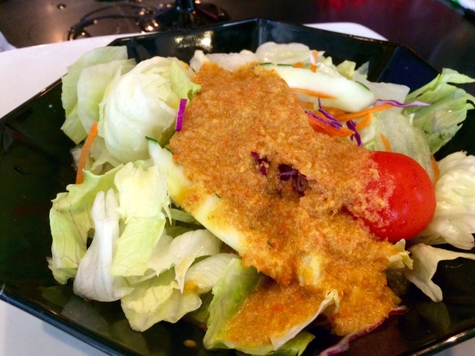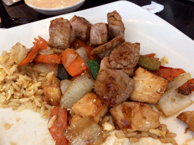 Our first course was miso soup followed by salad with ginger dressing; not surprising, pretty traditional and served at just about every hibachi restaurant. I’m torn between yearning for a fresh new take on the traditional Japanese soup and salad- something completely unique from what every other restaurant of this kind serves and the feeling of keeping with tradition; knowing that people have come to expect and count on these staples when they come to a place like this. What’s your take on this? Are you a traditionalist or someone who prefers more modern twists?