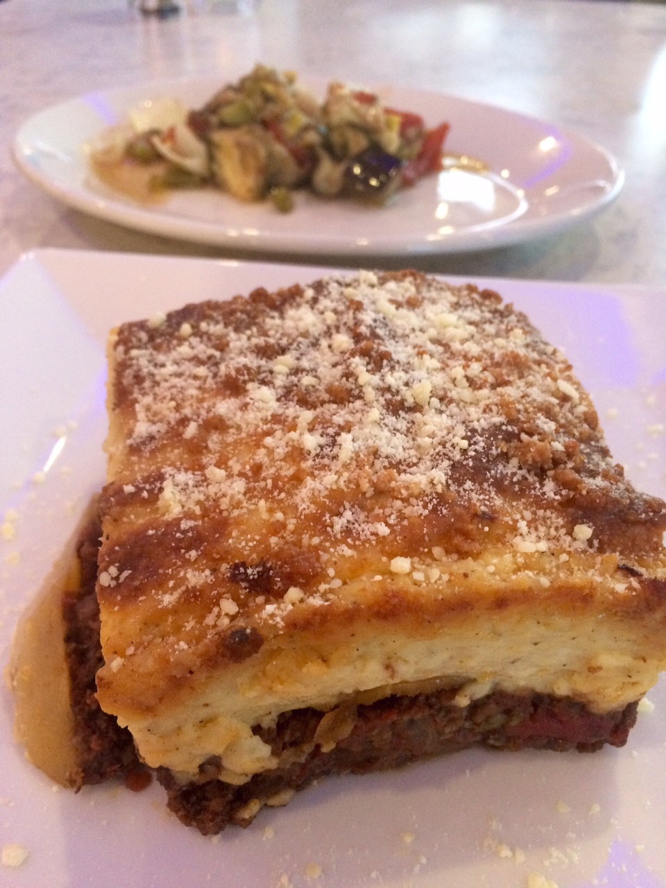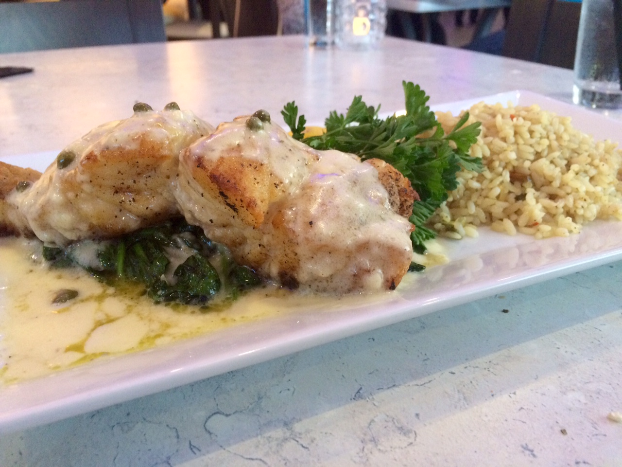 For our entrees, I selected the Moussaka which came with a side Greek salad. The salad was bright and beautiful and had so much to offer. The seasoning was spot on as was the dressing. I really enjoyed it. The Moussaka had layers of eggplant & potatoes and was topped with ground beef & béchamel sauce. The aromatics of cinnamon could could be detected as the dish was set down in front of me. By this time, I was already beginning to get full but was able to get a few yummy bites in before calling it quits. My companion ordered one of the specials of the night: the fresh Florida Black Grouper. It was baked & sautéed in an extra virgin olive oil / lemon caper glaze and served a top a bed of sautéed spinach and a side of rice pilaf. The entree came with a Greek soup called avgolemono, which was basically chicken and rice soup. It was very lemony, which is a good thing if you like lemon, a little overwhelming if not.