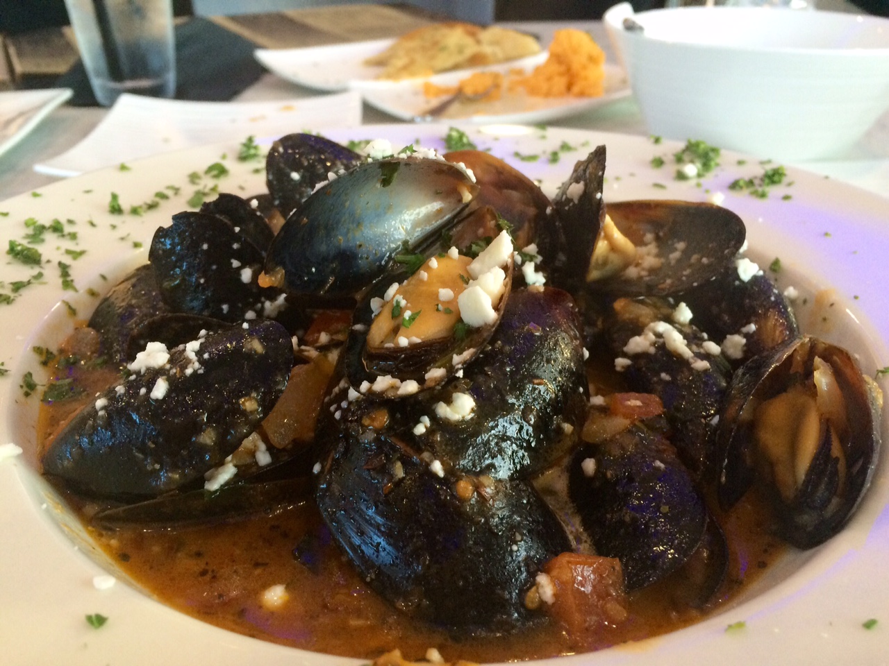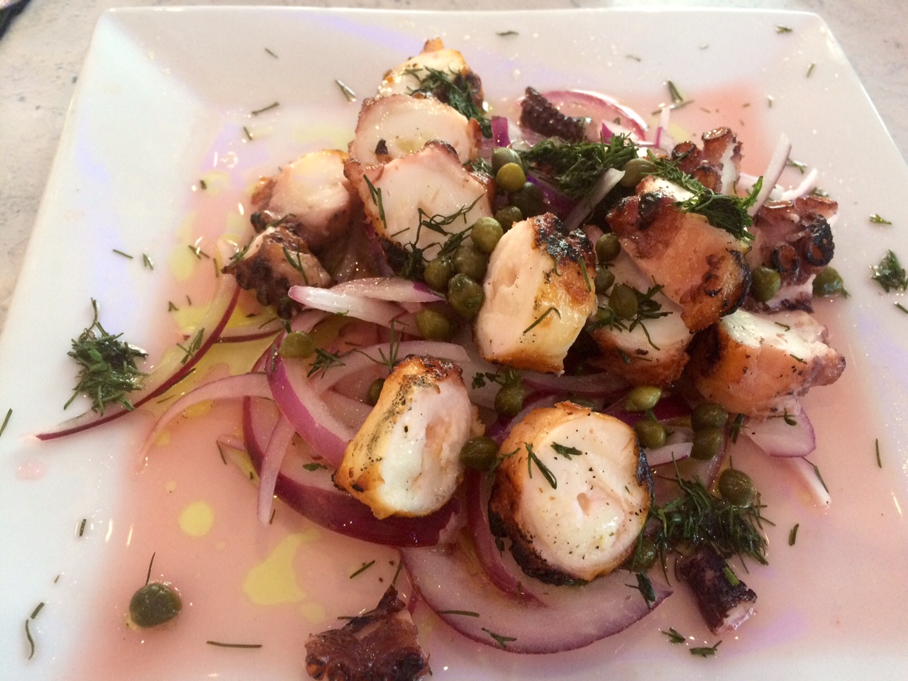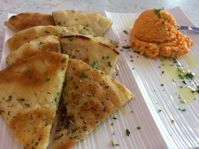 Soon followed a plate of warm crispy pita served with a red pepper & feta spread. It was delicious!! This scrumptious appetizer is compliments of the house in lieu of the standard bread basket. Good call. I scanned the menu and of course to my delight, I spotted octopus. Yes, please. My companion ordered the Mediterranean mussels. The octopus was grilled and although the description on the menu read charbroiled and marinated in olive oil it was actually served with a red wine vinaigrette and topped with dill. The dish had layers of flavors and certainly pleased the palate. Although I’m not much of a mussels fan, I did try the broth and thought it also was very flavorful. My companion cleaned his bowl, so I’ll take that as a sign that he enjoyed his dish as well.