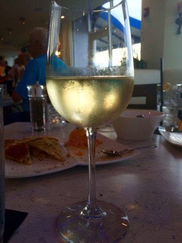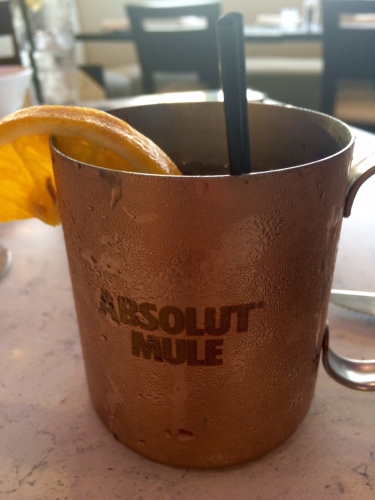 I had the opportunity to dine at Rafina’s recently and am excited to share with you my experience. It was a Sunday just before 7pm and the place was nearly full, an impressive sight, especially being in the middle of summer. We were greeted at the hostess stand and shown immediately to our table. Soon after, our server Kristen came over and introduced herself and asked if we’d like to get started with some drinks. I chose a house Greek white wine and my companion chose the Orange Moscow Mule.