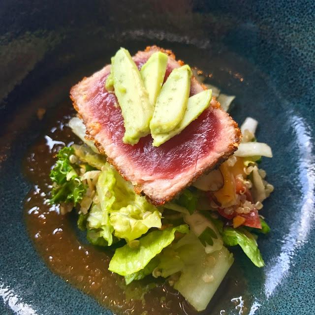 Yellowfin Tuna Salad.. Brown Chile Crusted Tuna, Kale, Roasted Corn, Quinoa, Toasted Almonds, Avocado, Island Slaw, Field Greens and dressed with a Soy Sesame Vinaigrette. The tuna had a lovely sear on it and was a wonderful accompaniament to this creative version of a field greens salad.