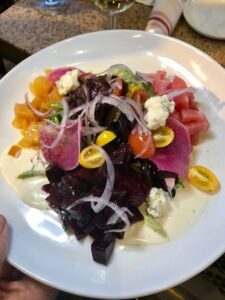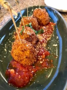 I was invited to a tasting with along with other media/bloggers. I started off with a most delicious glass of baby Amarone. I savored every last drop. The food kept flowing: from the signature roasted garlic and yummy crusty bread (served complimentary to all dining guests), Prosciutto de Parma pizza, chicken wings with caramelized onions, arancini, beet salad, salmon and their famous wood-fired apple tart served with cinnamon gelato.