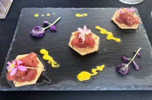 Relax and unwind in their beautiful patio dining area, where you will be surrounded by nature & water. This is where our group of bloggers gathered for a brunch tasting. Every dish that was brought out had a flare to it and each was exceptional. We started out with an Amuse Bouche of Tuna Poke (gc) artfully plated on a black slate. Next was the Banana Bread French Toast, which was my personal favorite. On top of this most wonderful gluten-conscious French toast (which I still can’t get over had little to no gluten) was bananas foster, Marsala wine, whipped cream and berries. I believe I am drooling as I am writing this now. lol! Our next course was a Crab Egg Benedict which featured lovely lump crab cakes topped with poached cage-free eggs and a delicious hollandaise sauce. The final tasting of the day was the Tuna Poke Bowl which was made with sushi grade tuna loin, on top of quinoa, brown rice, avocado, sesame seeds and cucumbers.