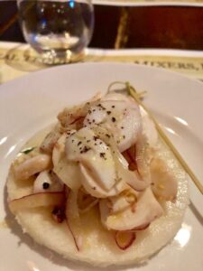 Jicama tostada topped w/octopus ceviche paired with Blanco Tres Agaves tequila