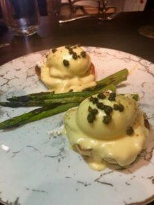 We started off with a Bloody Mary and a Peach Bellini. Then our server Julia surprised us with this beauty. An Italian Ice Mimosa made with liquid nitrogen. Check out the baby spoon that came with it, so cute! Can you say “Wow” factor?!?