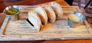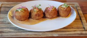 Tapas: Vegetable Dumplings with sweet serrano chili sauce ($12), Coconut Crusted Shrimp with sweet mango serrano sauce ($15), and Braised Meatballs with house made tomato sauce ($13).