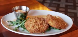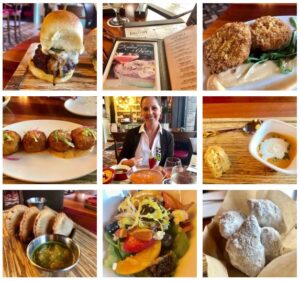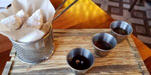 First out was the gumbo soup. This soup hit all the right notes and flavor profiles for me. It was a great surprise since I had never been one to fancy gumbo before. The warm crusty bread was a nice compliment as well. Great job, Chef! Next up was the Natchitoches Beef Pies (beef empanadas). Natchitoches is a city in Louisiana that is famous for making these little pillows of heaven. They were packed with flavor and I enjoyed the garlic dipping sauce it came with. The other sauce, we were given advance warning, was hot so I stuck to the garlic one. The crab cakes were not only adorable but very tasty. The perfect shareable dish. Chef sent out their signature salad, the Mardi Gras Peach & Berry. What a gorgeous salad; it just popped with color. Chef Simon explained to us that he pickles and poaches the peaches in the peak of season so that he is able to use them year round. We both really liked the freshness of each component of the salad. Our next tasting was the Baton Rouge Beef Sliders and the Shrimp Po Boy. The beef sliders were topped with housemade bacon jam, abita beer cheese, caramelized onion and pickled serrano (I actually didn’t know there was a serrano pepper in there, so if you’re a wimp like me in the spice/heat department, don’t worry). This burger was THE BOMB!!! I am love with it for sure. The Shrimp Po Boy, on the other hand, lacked a little flavor for me and out of all the dishes we tried, was my least favorite. But not to worry, we got right back on track again with the Lobster Bisque made with cognac cream. It was heavenly and I would highly recommend this dish. It ranks up there as one of my favorite lobster bisques of all times. Marti had never tried fried green tomatoes before and I’m a fan when done right and boy did these deliver in the flavor department. They too, raised the bar on which all fried green tomatoes will forever be judged. OK, I’m sure by now you’re wondering how in the world we could still fit anything into our bellies, right?!? Well, we couldn’t resist at least trying a beignet. When you think of beignets, most undoubtedly the famous place in New Orleans, you know the one comes to mind. After popping one of these lovelies in my mouth, I just closed my eyes and within seconds, I began to feel as if I had been transported to New Orleans. These beignets were served with 3 unique dipping sauces; berry jam, spiced chocolate and orange marmalade.