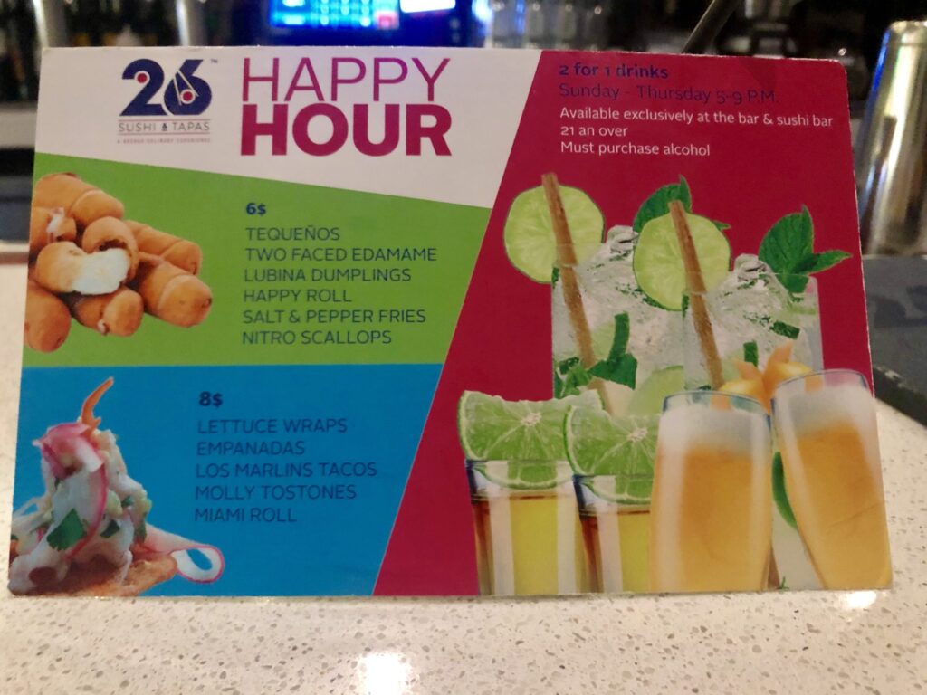 Apart from updated summer offerings, 26 Sushi & Tapas also boasts an impressive, four-hour long Happy Hour available Sunday through Thursday from 5PM-9PM. The Surfside mainstay has updated their Happy Hour food selection to include several Tapas-style items priced between $6 and $8 dollars. Guests 21 and over can enjoy 2-for-1 drink specials depending on the day: