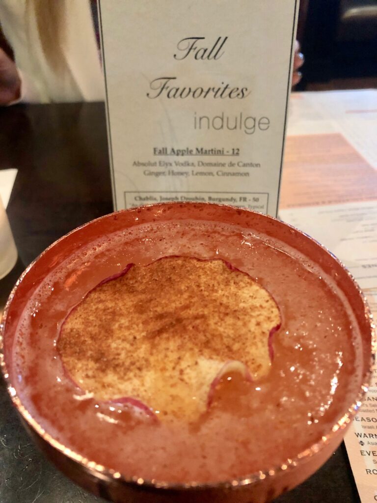 Fall Apple Martini ($12) Absolut Eryx Vodka, Domaine de Canton, Ginger, Honey, Lemon, Cinnamon