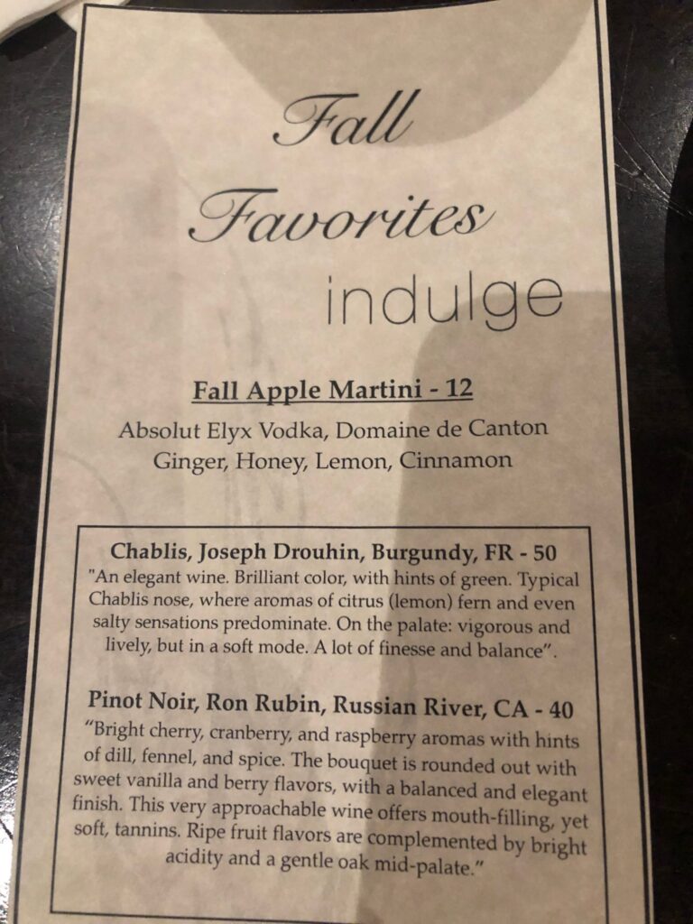 My companion and I were seated in Jake’s section again, who was our wonderful server from our visit last Fall. You can read about that post here. My companion enjoyed the wine that Jake had recommended so much on our last visit that she ordered it again. Involuntary Commitment Cab Franc. Me? I went with one of their Fall specialty cocktails, the Apple Martini. The apple slice garnish was not only pretty but soaked up all the deliciousness that lay underneath.