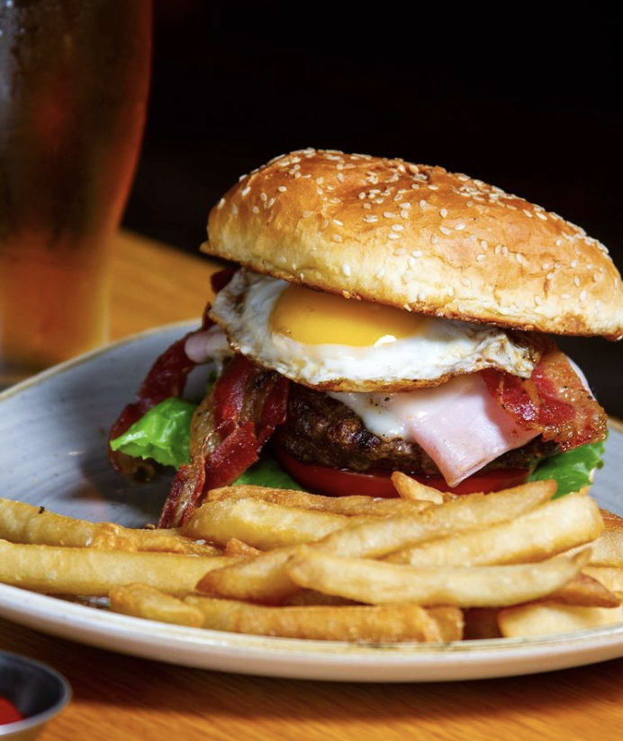 Prohibition Burger ($18.50): A flavorful burger blend with white cheddar, Applewood bacon, lettuce, tomato, onion, secret sauce, and dijonnaise, served with crispy fries.