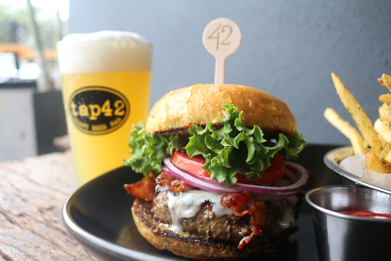 Copper Burger ($16): Savor a house-blended patty topped with sharp cheddar, grilled onions, fresh tomatoes, lettuce, and copper sauce on a pumpernickel bun.