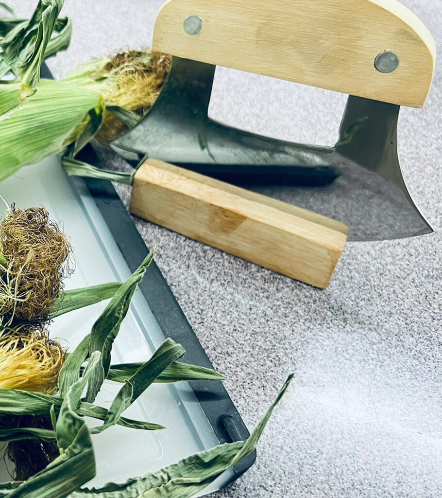 That’s why I came up with my own safer method. It involves softening the corn in the microwave first, then using a rocking ulu knife to slice it safely.